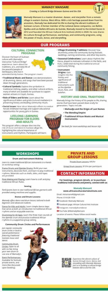 African Cultural Arts Institute (ACAI) offers a range of programs and services designed to preserve, promote, and share the cultural richness of Africa—especially through music, dance, and storytelling. Our offerings serve individuals, schools, organizations, and communities both in the U.S. and in Africa.